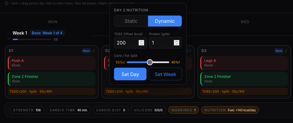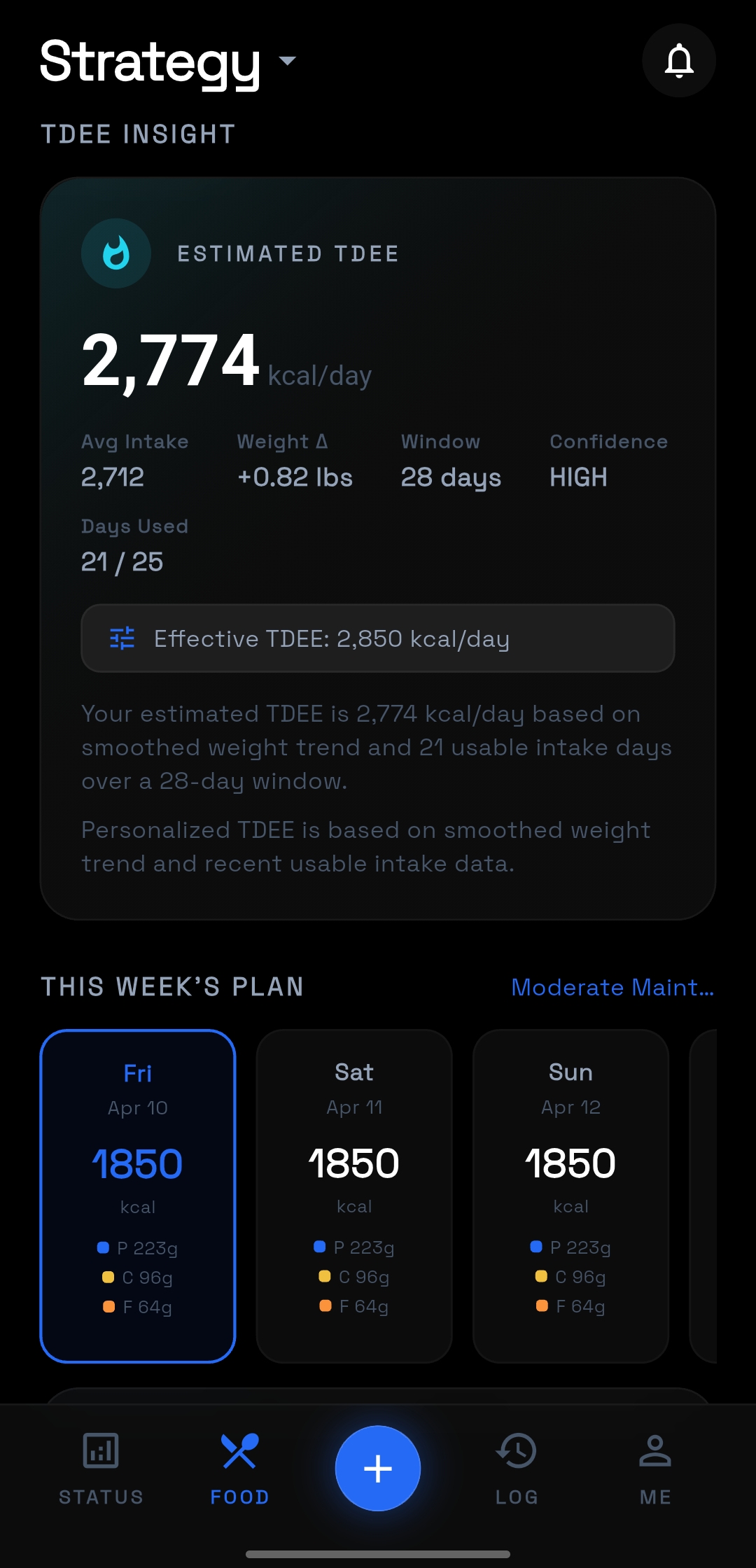 Daily nutrition targets should not be static guesses. The strategy view makes the TDEE logic visible so adjustments feel deliberate rather than arbitrary.
